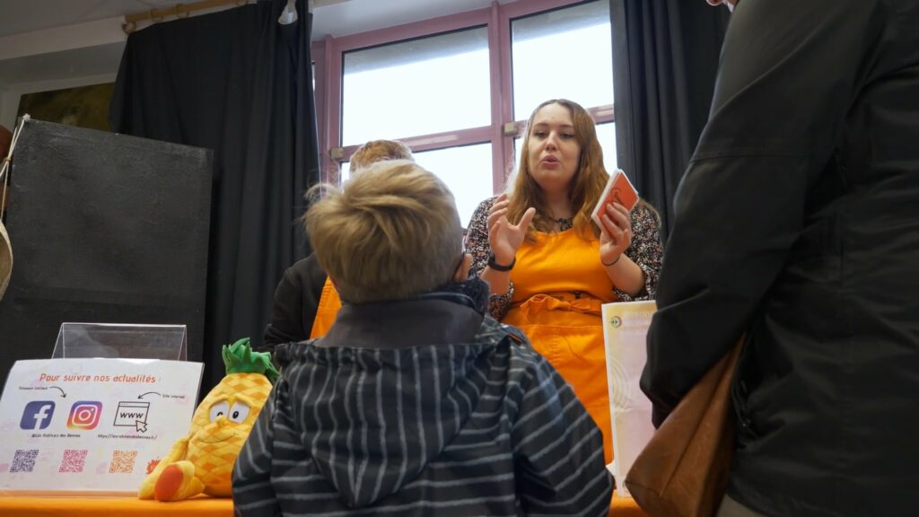 Léa Dairaine-Têtu présente les actions menées par l’association antigaspi Les Robin·e·s des Bennes.